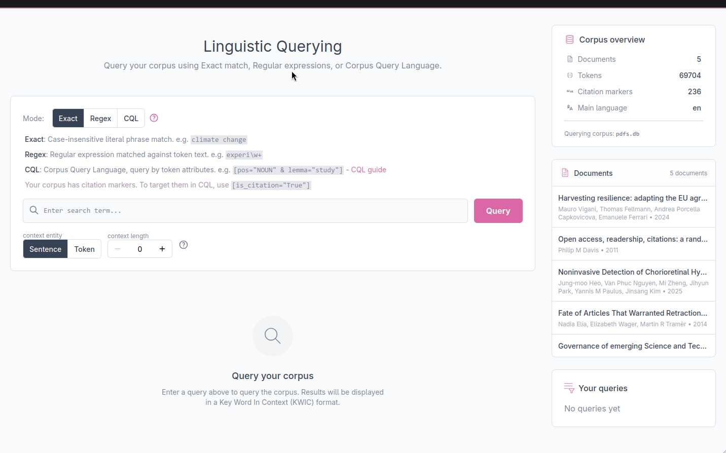 The method uses the spaCy NLP library. We use its text processing pipeline to tokenize and sentencize the corpus and annotate each token and we use the spaCy matcher for running queries.