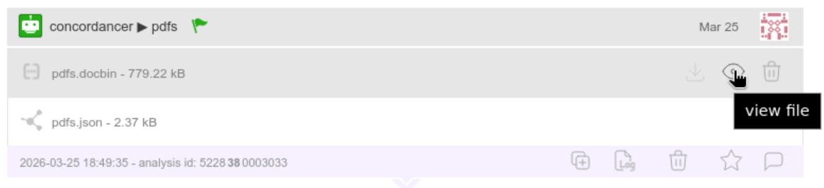 Once the method finishes running, a .docbin file will be produced. This is the file used to persist the processed documents. Clicking docbin file’s ‘eye’ button opens the concordancer web application in a new tab and starts loading your documents.