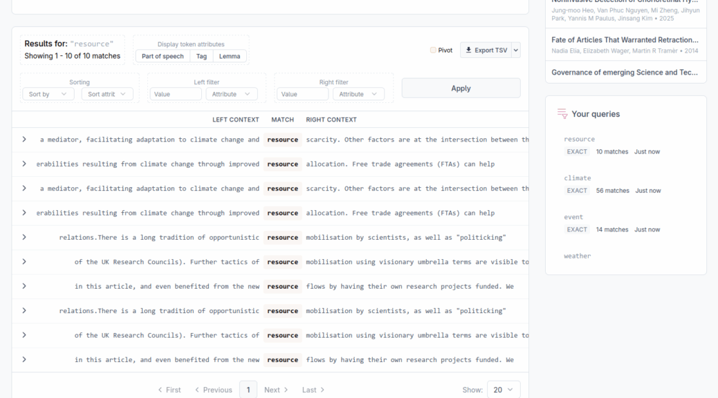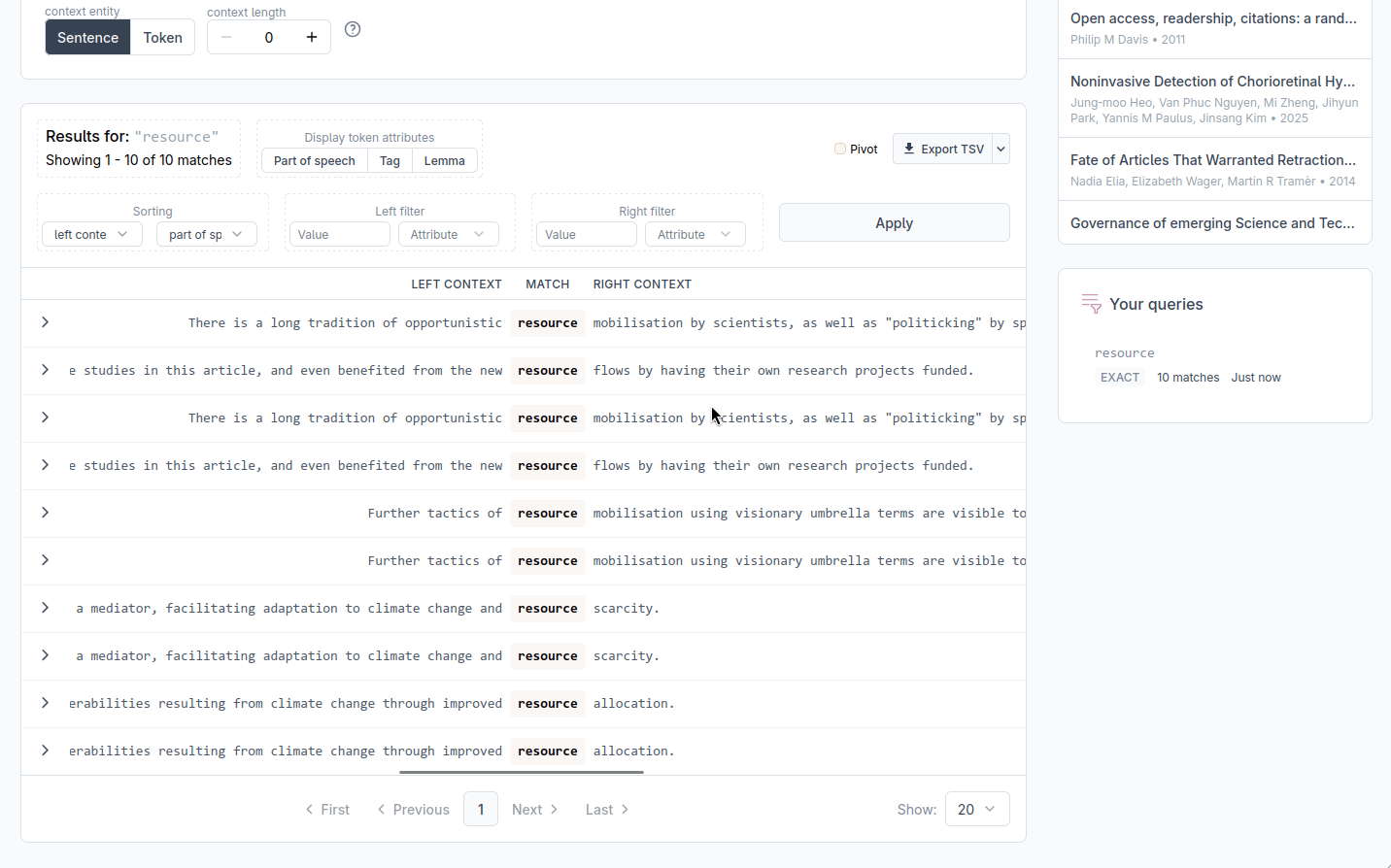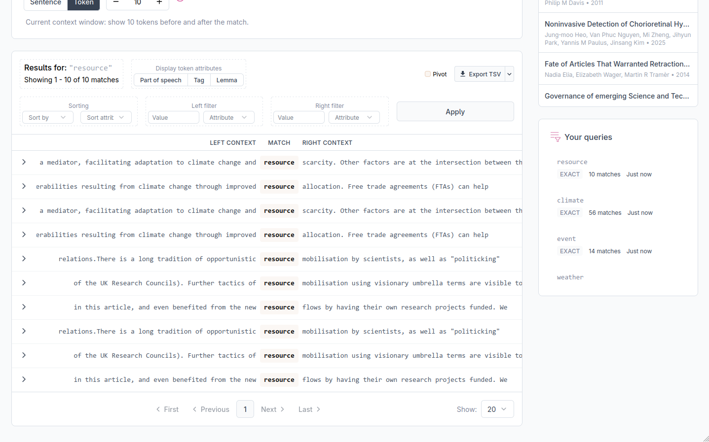 You can restrict results to those where a specific position carries a specific value. Set the position (left or right context), the attribute (text, pos, tag, or lemma), and the value to match, then click Apply. Both a left-context filter and a right-context filter can be active at the same time. This filter applies only to the tokens directly adjacent to the match.