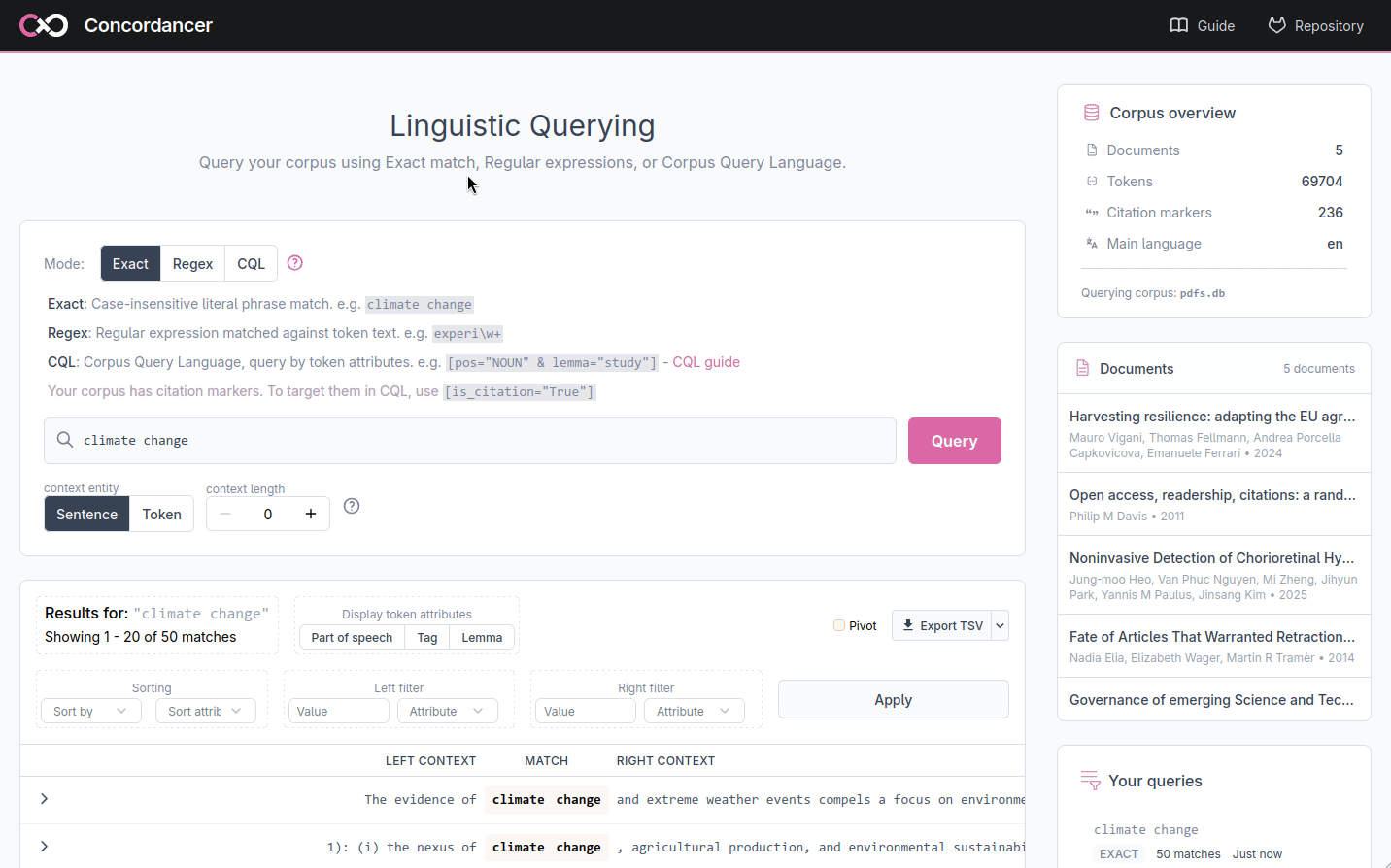 Results are displayed in a KWIC table with three columns. The left column shows the context that precedes each match, the middle column shows the matched tokens, and the right column shows the context that follows. Aligning all matches at the center of the display makes it easy to scan the surrounding text and is the common format of KWIC displays.