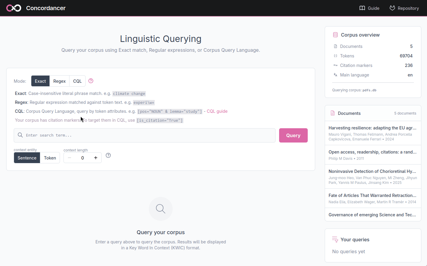 For usage of the concordancer, your corpus is composed of several documents. The method parameters allow you to specify which fields of your corpus correspond to the text and which fields correspond to documents’ title, authors, venue, and other metadata.