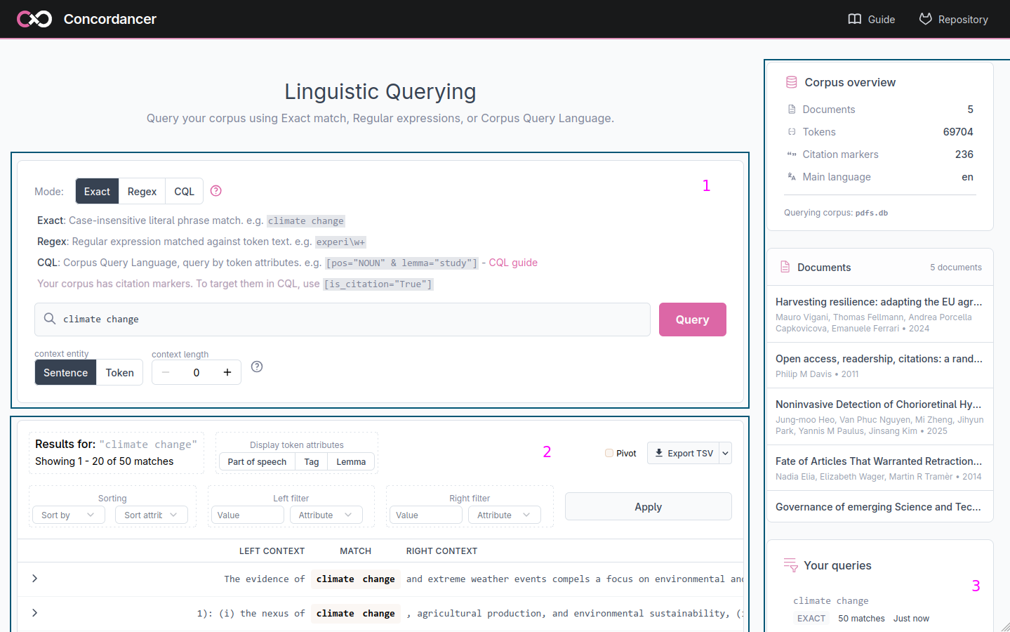 The web application is divided into several areas: a search bar (1) where you enter your query and configure the context, a results table (2) that displays the matches in KWIC format. A sidebar (3) on the right shows the corpus overview, the list of documents and a history of your previous queries so you can return to them at any time.